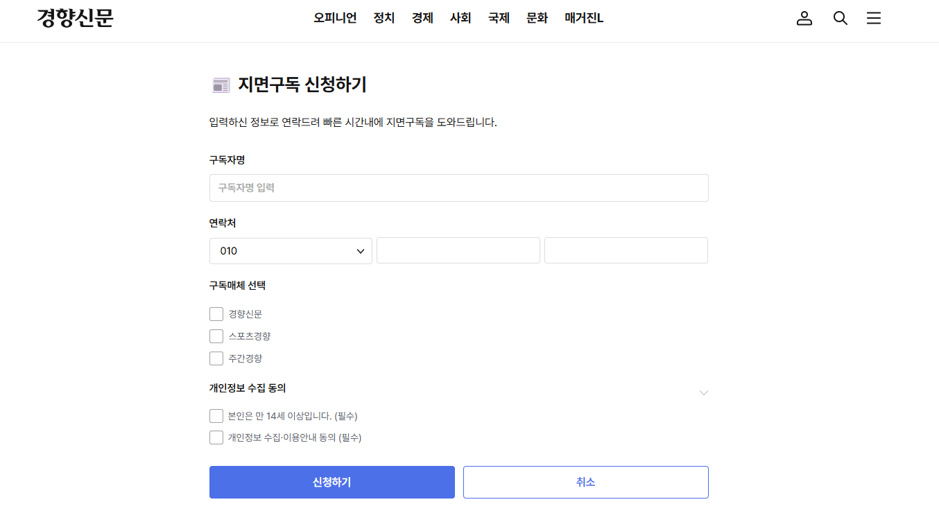 경향신문의 지면 신문을 구독하려면 공식 홈페이지의 구독 신청 페이지를 통해 신청할 수 있습니다. 신청 시 구독자명, 연락처, 구독 매체 등을 입력하고 개인정보 수집 및 이용에 동의하면 신청이 완료됩니다. 신청 후에는 담당 지국에서 연락을 통해 구독 절차를 안내해 드립니다.